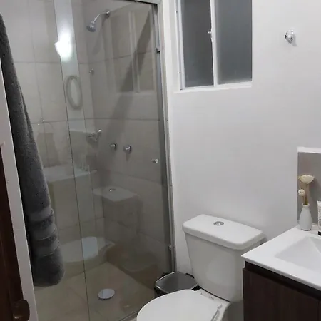 A kitchen is fully equipped for self-catering purposes with a microwave, a fridge, and kitchenware. Offering Brazilian dishes, Rincon do Brasil is situated within close proximity of this apartment.